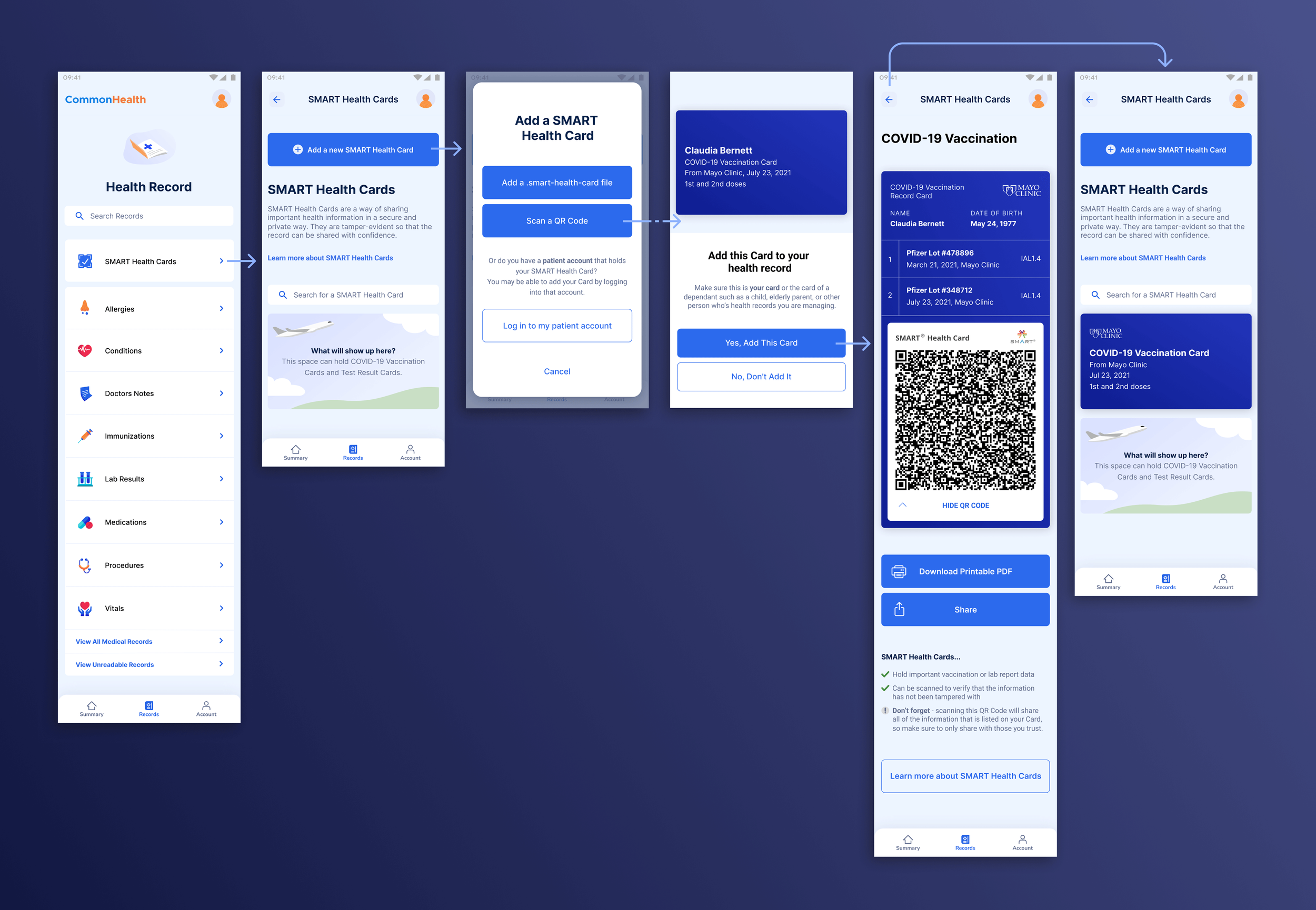 Key screens from our proposed designs for adding SMART Health Cards (verifiable records) into the CommonHealth app, eventually scaled down during implementation.