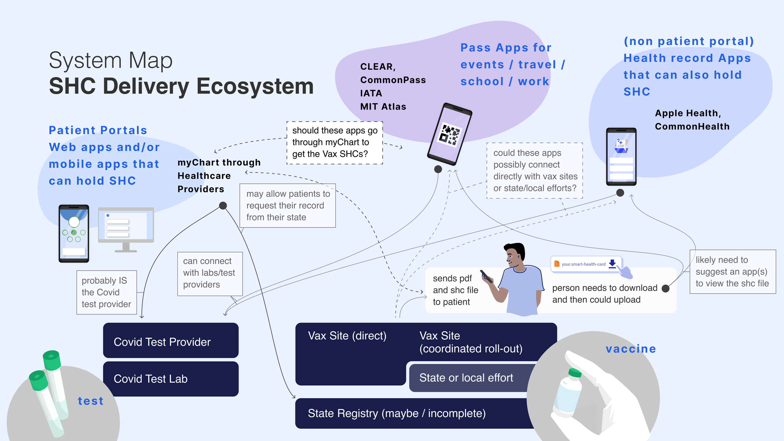 It was immediately apparent that the user experience of this new verifiable record data standard (SMART Health Cards) would be difficult to control. The verifiable record effort involved several different parties: the partners contributing to the development of SMART Health Cards, patient apps, COVID testing and vaccination sites, state and city government efforts, and more. The following diagram illustrates early thinking on how people could access these new records:
